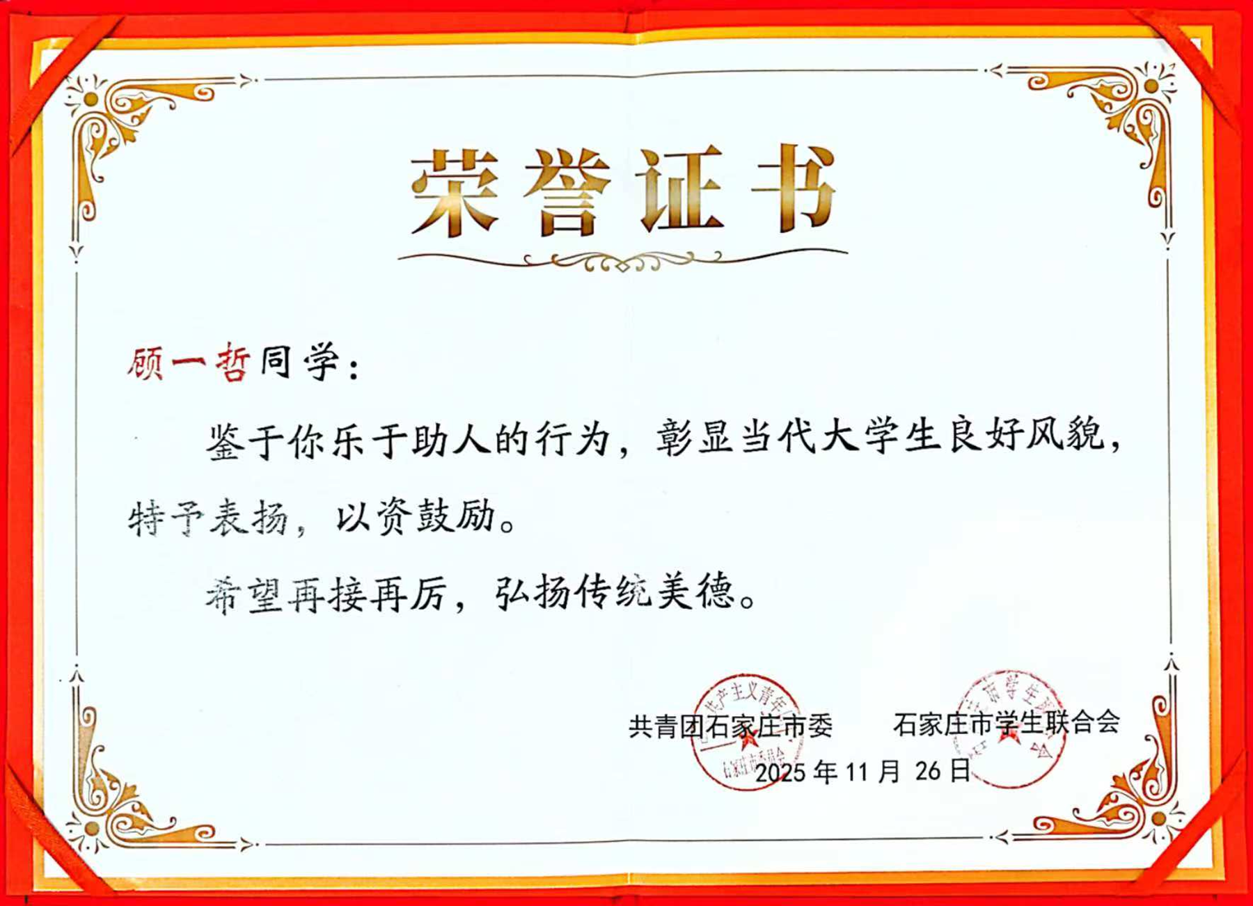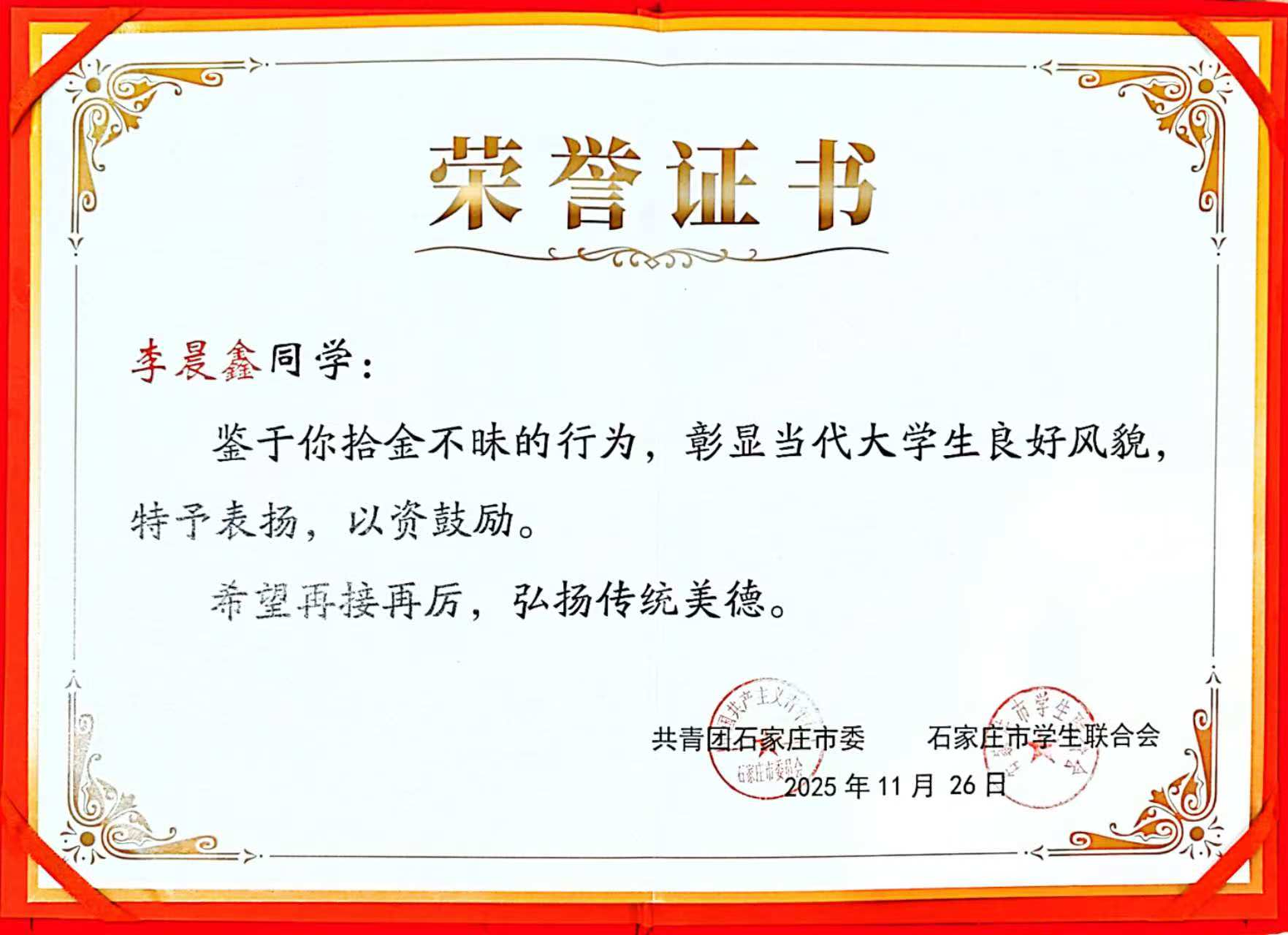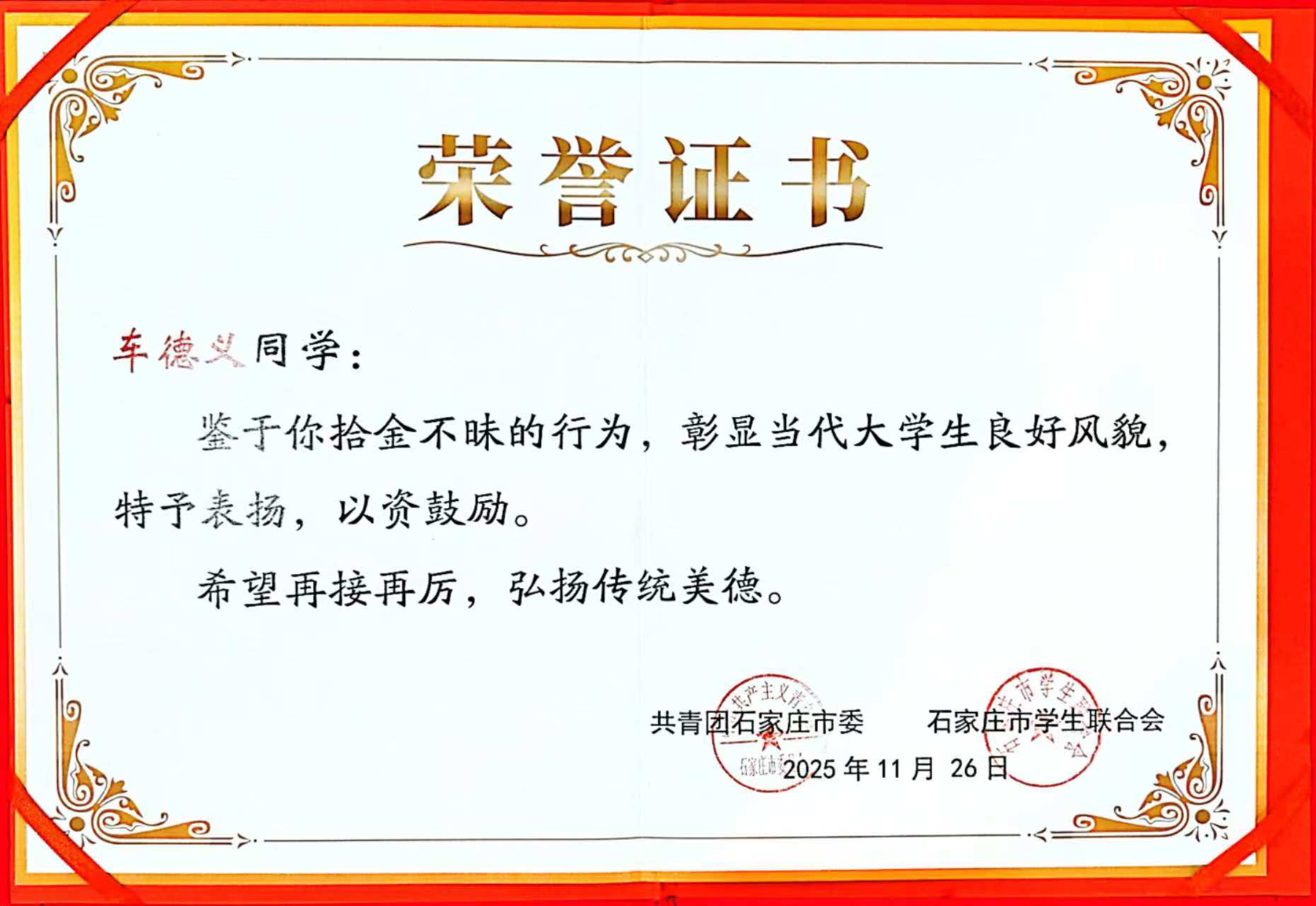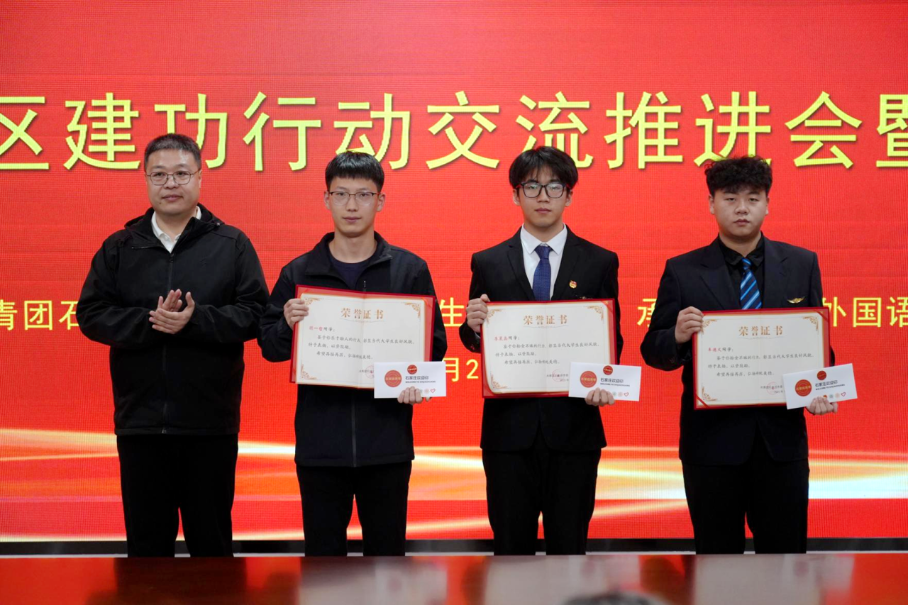 共青团石家庄市委副书记李茂青为河北外国语学院拾金不昧的李晨鑫同学、车德义同学,石家庄信息工程职业学院助人为乐的顾一哲同学颁发了表扬证书和奖品,激励更多大学生积极投身社区服务。