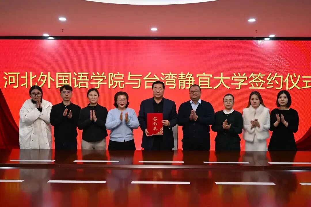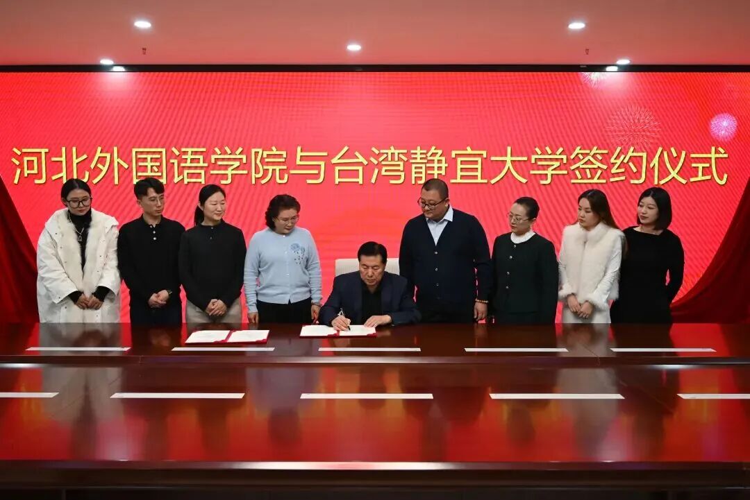 2026年1月21日,河北外国语学院与台湾静宜大学正式签约。河北外国语学院董事长、校长孙建忠院士与台湾静宜大学校长林思伶教授在两校合作协议书上正式签字。两校一致同意:加强师生交流,台湾静宜大学每年接收两名河北外国语学院学生免费赴中国台湾地区学习;加强图书期刊、学术著作及教学研究成果交流;共同举办各项学术活动;共同开展科研合作。
